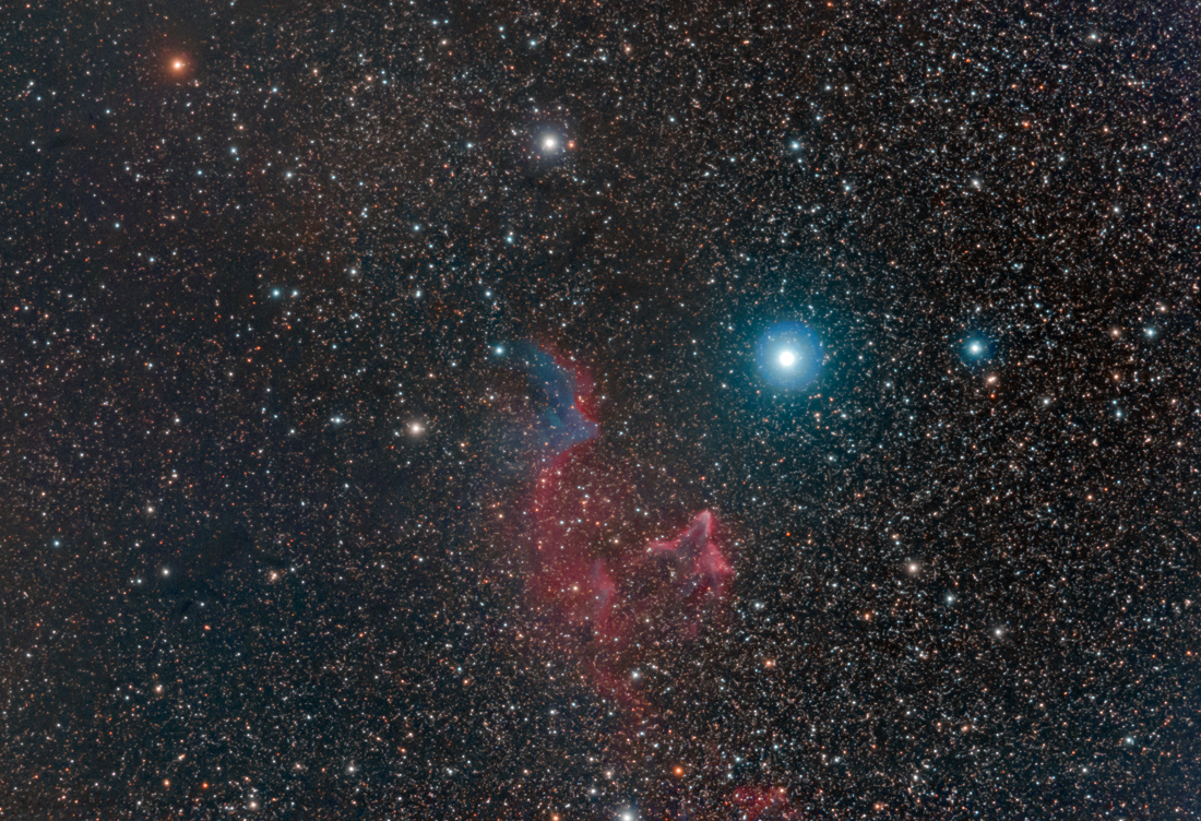 The bright bluish star is Gamma Cassiopeiae. It is currently evaporating two nearby clouds of gas, IC 59 and IC 63. The leading edges of these clouds glow strongly in the intense bath of radiation from this hot star.