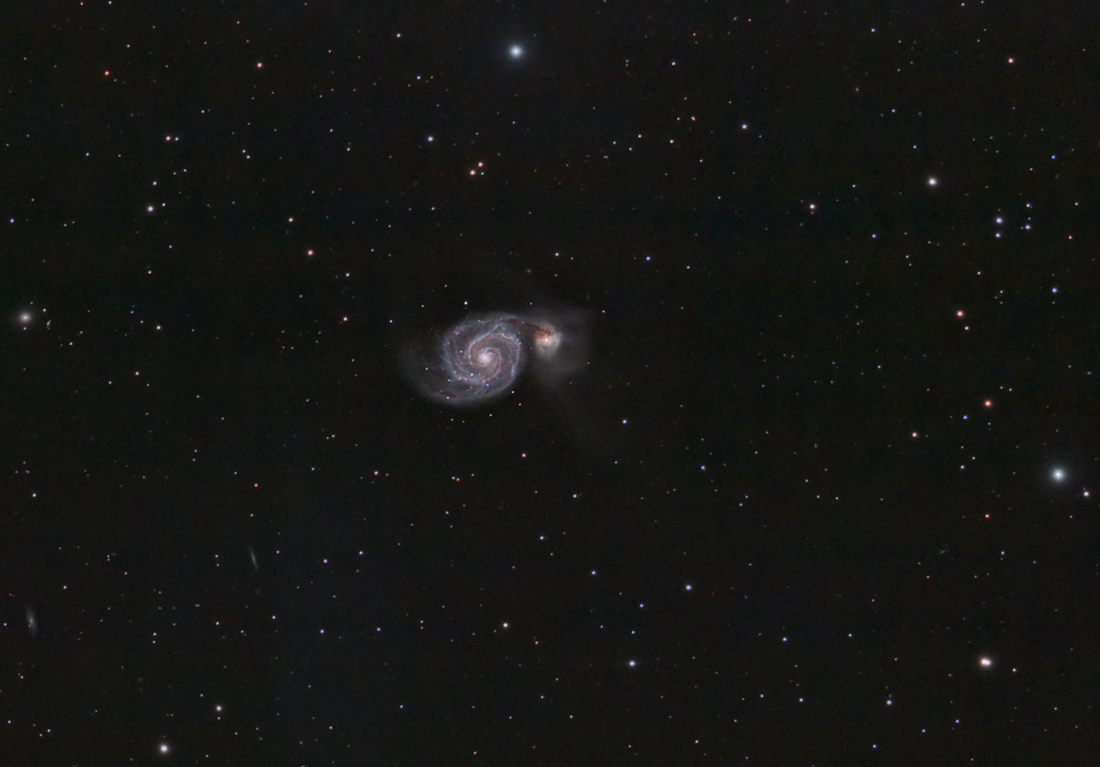 M51 is an interacting grand-design spiral galaxy. It lies in the constellation Canes Venatici, and was the first galaxy to be classified as a spiral galaxy. Its distance is approx 35 million light-years from the Earth.