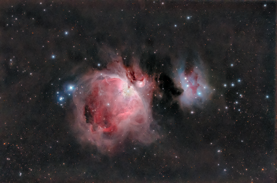 The Great Orion Nebula, M42, situated in the Milky Way, approx 1400 light years from the Earth. It is the closest region of massive star formation to Earth. To the left is a blue nebula, NGC 1973, known as The Running Man Nebula. Technical info: |