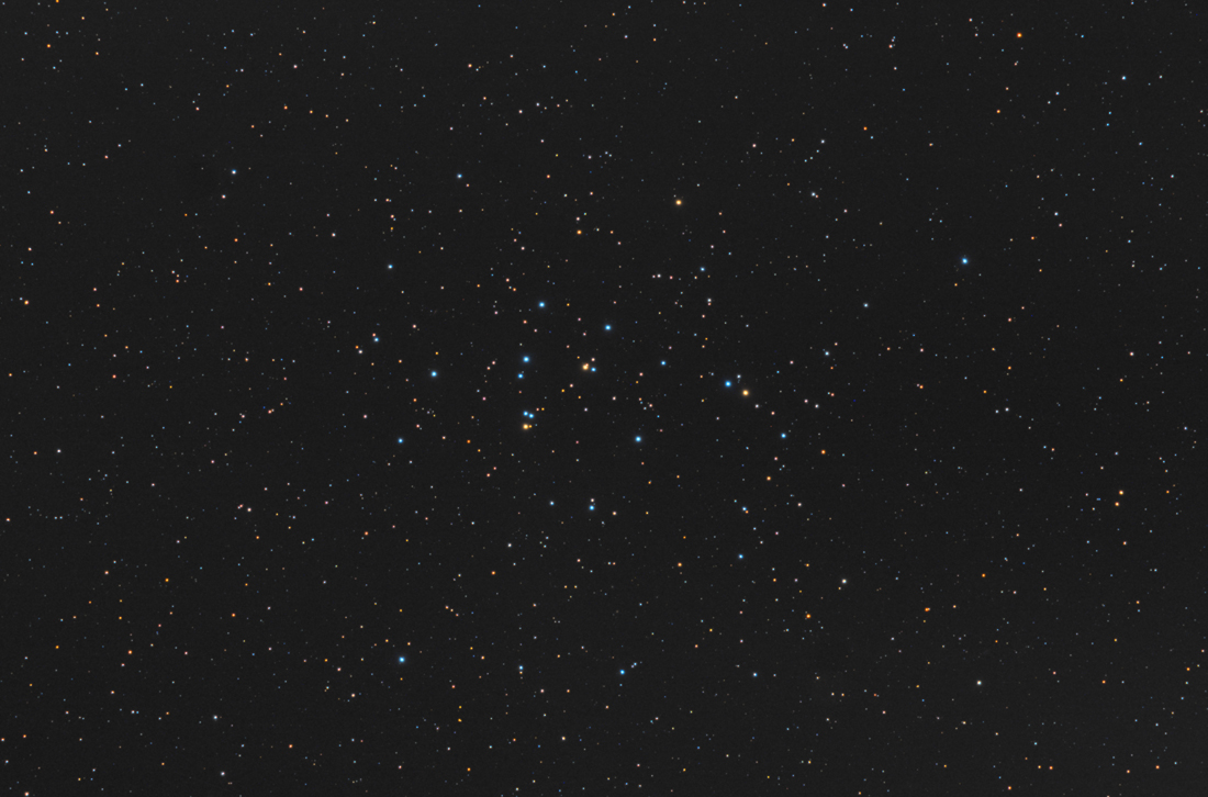 The Beehive Cluster, also known as Praesepe (Latin for "manger"), M44, is an open cluster in the constellation Cancer. It is one of the nearest open clusters to the Solar System, and it contains a larger star population than most other nearby clusters. Under dark skies the Beehive Cluster looks like a nebulous object to the naked eye; thus it has been known since ancient times. The Cluster contains both red giants and white dwarfs, which represent later stages of stellar evolution. The cluster's distance is often cited to lie between 520-610 light years. it is about 600 million yearsold. This is equivalent to the age of the Hyades (~ 625 million years). The bright central core of the cluster has a diameter of about 22.8 light years. The Beehive is most easily observed when Cancer is high in the sky; in northern latitudes this occurs during the evening from February to May. The cluster fits well in the field of view of a pair of binoculars or a telescope of low power. Technical info: |