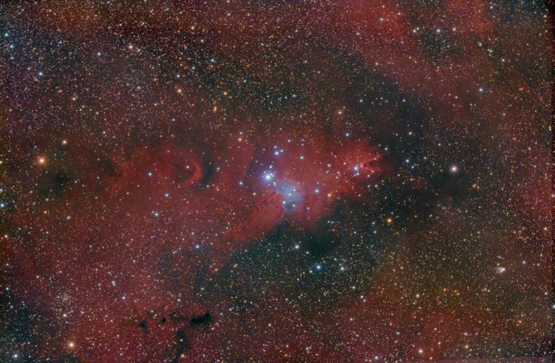 The diffuse Cone Nebula, so named because of its apparent shape, lies in the southern part of NGC 2264, the northern part being the Christmas Tree Cluster. It is in the northern part of Monoceros, just north of the midpoint of a line from Procyon to Betelgeuse.