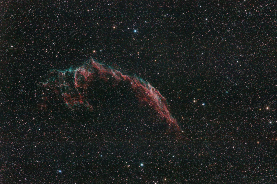 The Eastern Veil Nebula, is a cloud of heated and ionized gas and dust in the constellation Cygnus. It constitutes the visible portions of the Cygnus Loop, a large but relatively faint supernova remnant. The source supernova exploded circa 8000 years ago, and the remnants have since expanded. The distance to the nebula is not precisely known, but Far Ultraviolet Spectroscopic Explorer (FUSE) data supports a distance of about 1,470 light-years.