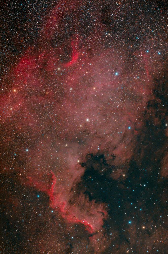 North America Nebula, NGC 7000, approx 1600 light years from the Earth, is an emission nebula in the constellation Cygnus, close to Deneb (the tail of the swan and its brightest star). The remarkable shape of the nebula resembles that of the continent of North America, complete with a prominent Gulf of Mexico. Technical info: |