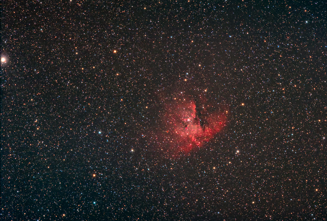 NGC 281, also known as the Pacman Nebula for its resemblance to the video game character, is an Hydrogen II region in the constellation of Cassiopeia and part of the Perseus Spiral Arm. It includes the open cluster IC 1590, the multiple star HD 5005, and several Bok globules.
