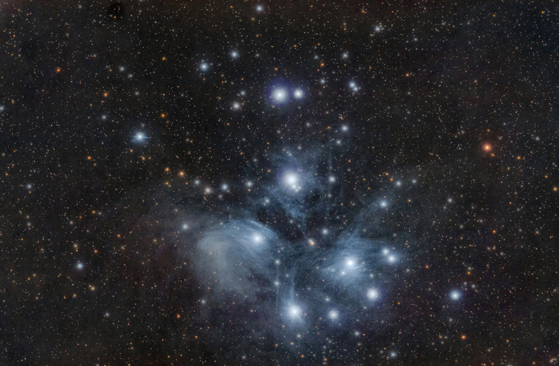 Pleiades, M45, or Seven Sisters, approx 440 light years from the Earth, is an open star cluster located in the constellation of Taurus. The Pleiades are at the moment passing through a cloud of interstellar medium, causing a blue glow around the stars. Technical info: |