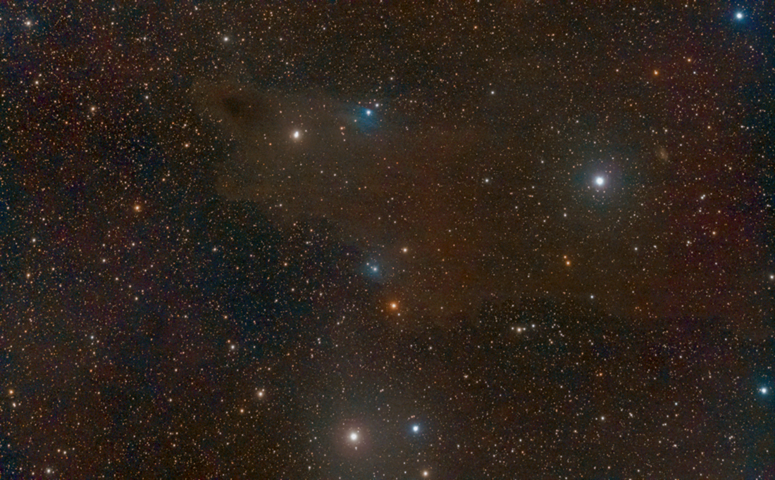 Lynds Dark Nebula 1235, Van den Bergh 149 (blue reflection nebula under) and Van den Berg 150 (blue reflection nebula above), spans about 15 light years and lies about 650 light years away from Earth. The nebula, often called the Shark Nebula, is a molecular cloud in the constellation Cepheus.
