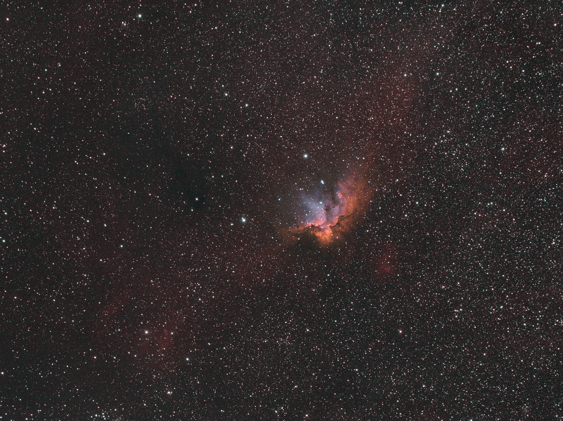 The Wizard Nebula is located in the constellation Cepheus and is approximately 8000 light years away. It is a young open cluster with the gas and dust making up the Wizard. The gas and dust spans about 150 light years across.